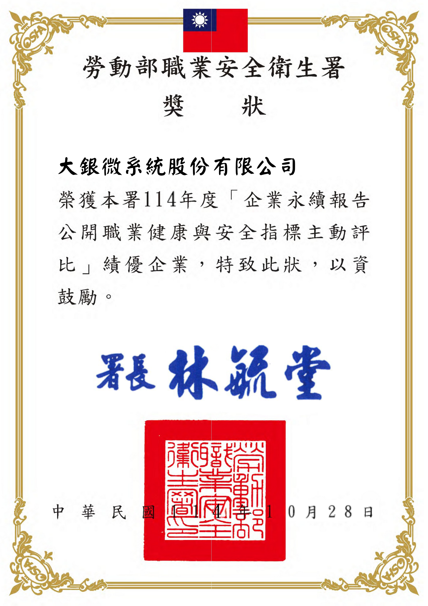 榮獲企業永續報告公開職業健康與安全指標主動評比績優企業