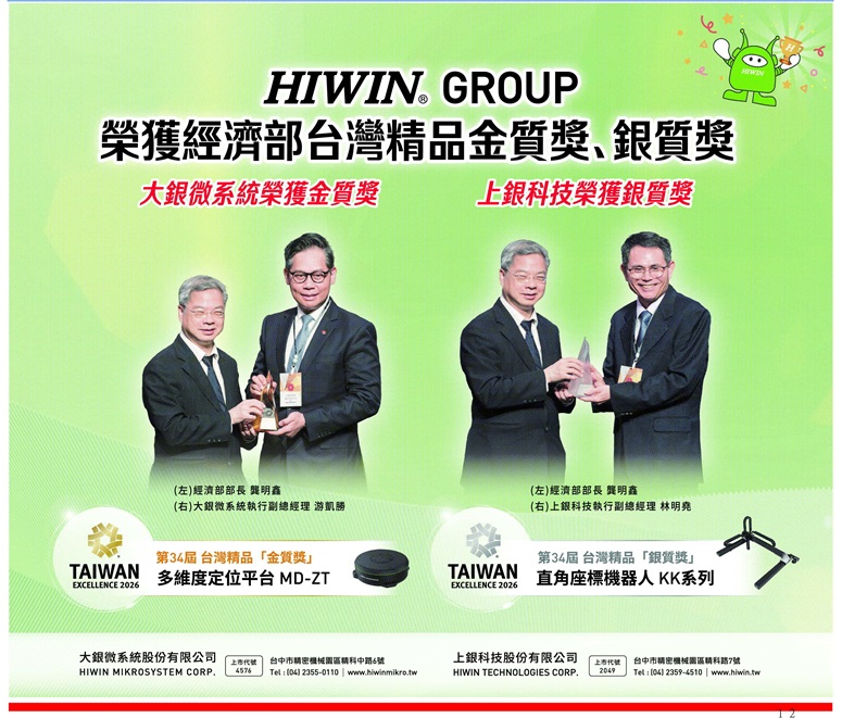 HIWIN GROUP榮獲經濟部台灣精品金質獎、銀質獎